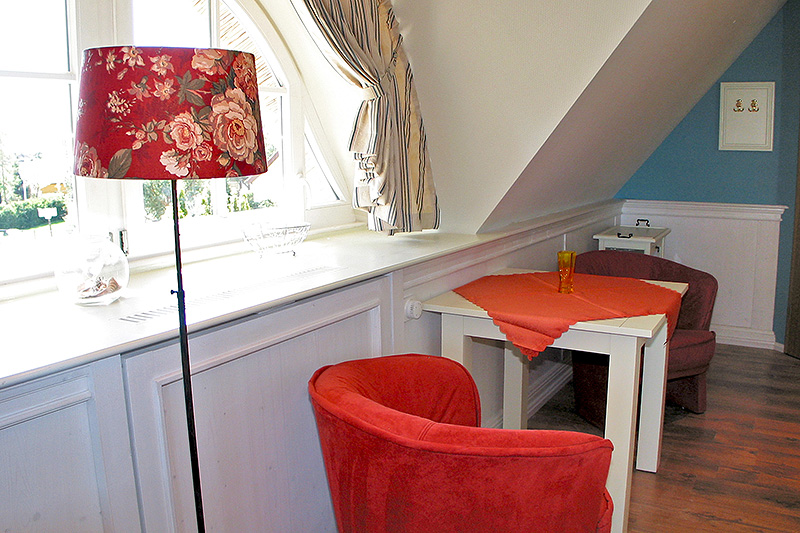 - Wohnbereich mit zwei kompfortablen Sesseln, Bartischchen, Fernseher sowie einer kleinen Literatur- & Spieleauswahl